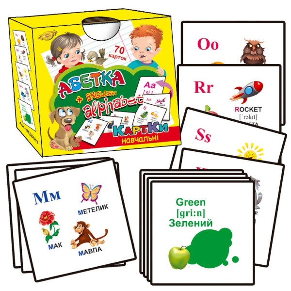 Представляємо вам комплект чудових карток «АБЕТКА + ALPHABET»! Вони не лише познайомлять вашу дитину з літерами української та англійської алфавітів, а й допоможуть зробити перші кроки у читанні та складанні слів. На кожній картці комплекту з одного боку зображено букву (українську або англійську), на іншій — дано добірку іменників, що починаються на цю букву, та відповідні картинки. Під час захоплюючої гри малюк: вчить і запам'ятовує ЛІТЕРИ; знайомиться з НАПИСАННЯМ слів; складає ЛІТЕРИ в СЛОВА; робить перші кроки у ЧИТАННІ; розширює словниковий запас! Комплектація «АБЕТКИ»: картки з літерами українського алфавіту – 33 шт.; картка з українським алфавітом – 1 шт.; картка з інструкцією - 1 шт. Комплектація «ALPHABET»: картки з літерами англійського алфавіту - 26 шт.; картка з англійським алфавітом - 1 шт.; картки з назвами квітів англійською мовою – 7 шт.; картка з інструкцією - 1 шт.