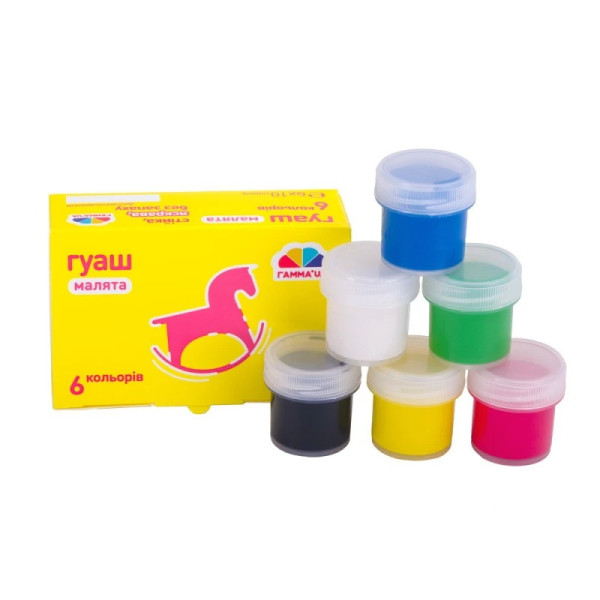 Гуаш – одна из самых первых красок, которые использует ребенок на своем творческом пути. Она яркая, быстро высыхает, не имеет неприятного запаха, а главное – безопасна для ребенка. Рисовать гуашью можно кисточками разных размеров и форм, поролоновыми спонжами или просто пальчиками. Никаких пределов для творчества. Серия Малыша создана специально для детей дошкольников. Гуаш ГАММА'UA изготовлена в Украине по новейшим технологиям. Благодаря этому она имеет приятную структуру, оптимальную консистенцию, не течет и в тоже время имеет идеальную густоту. После высыхания рисунки имеют бархатную матовую структуру и яркие цвета. Современные родители выбирают для своих детей именно гуашь ГАММА'UA Малыши из-за ее преимуществ перед аналогами: Набор из 6 цветов – оптимально для дошкольников, которые учатся работать с цветом. Большое количество оттенков может запутать ребенка и отвлечь от рисования. В набор вошли следующие цвета: зеленый, красный, желтый, синий, черный, белый Маленькие удобные для ребенка контейнеры с красками объемом 10 мл Яркая картонная упаковка привлечет внимание ребенка на полки магазина и побуждает к рисованию