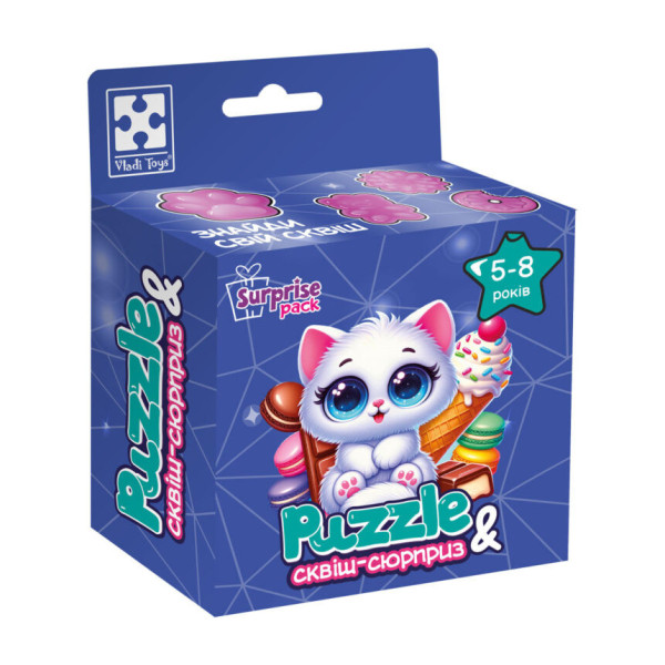 Игра развивающая пазлы с сюрпризом "Белый котенок" VT8030-03 знакомит ребенка с милым белым котенком, который так нежно смотрит с картинки. Но магия на этом не кончается! Внутри коробки скрывается сквиш-сюрприз – трендовая игрушка, которую обожают дети. Узнай, какой из этих мягких сюрпризов ждет именно тебя. Материал: картон. Возраст: 5-8 лет. Размер пазловой картинки: 22 х 23 см. Комплектация: пазл на 180 деталей, сквиш.