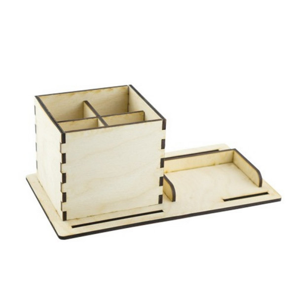 Настільний DIY органайзер для ручок та візитівок. Набір-конструктор деталей з фанери товщиною 4 мм, для складання органайзера-підставки, основним призначенням якої є організація зберігання візитівок та різних письмових принад (кулькових ручок, олівців, пензликів, ножиць та ін.) Застосування: з'єднайте деталі слідуючи поетапної схеми що додається; де необхідно, застосуйте клей: або ПВА або "Універсальний" від "Фабрики Декору". Дайте клею висохнути; після складання, готову конструкцію можна прикрашати за допомогою акрилових фарб тм "Фабрика Декору" або відразу використовувати за призначенням. Не містить токсичних речовин. Не давати маленьким дітям (може містити дрібні деталі).