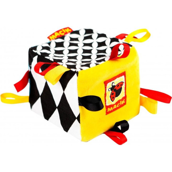 Кубик-игрушка серии Black & White TM Macik пошит из натуральных, разнофактурных тканей. Его контрастные изображения, линии и фигуры непременно заинтересуют малыша, ведь их так интересно изучать. Шелестящие детали и погремушка внутри подарят улыбку и радость. Разноцветные петельки малыш будет с интересом перебирать крохотными пальчиками. Очень важно, что эти детали помогут малышу в формировании зрения и развитии слуха, сенсорики и мелкой моторики рук. Кубик мягкий и совершенно безопасен для малыша! Игрушка прекрасно переносит щадящую стирку и быстро сохнет. Состав: х/б ткань; разнофактурные материалы; шейная фурнитура; звуковые элементы; поролон. Размер: 8х8х8 см.