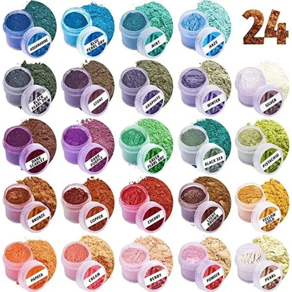 Набор из 24 баночек с пигментным порошком для эпоксидной смолы: 24 баночки с порошком слюды по 0,1 унции (2,8 г) и справочное руководство по использованию вашего нового эпоксидного пигментного порошка.